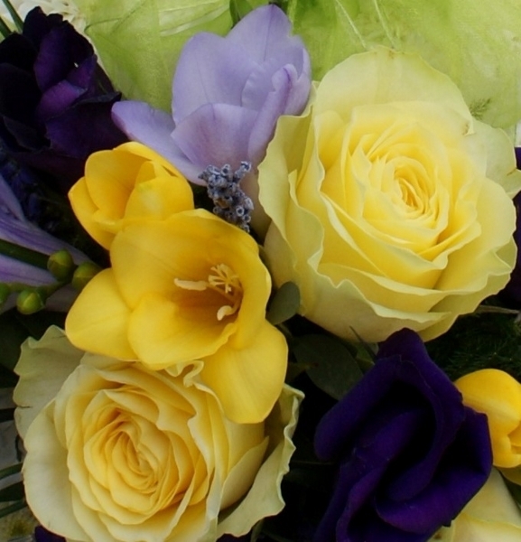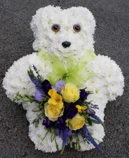 Teddy Bear £125.00 Add to Basket SKU: ID02 This charming teddy bear is based with white double chrysanthemums and features a spray containing quality roses, freesia, lisianthus and veronica with mixed foliage and a voile bow, measuring approximately 24 inches (60 cm) in height. Message: