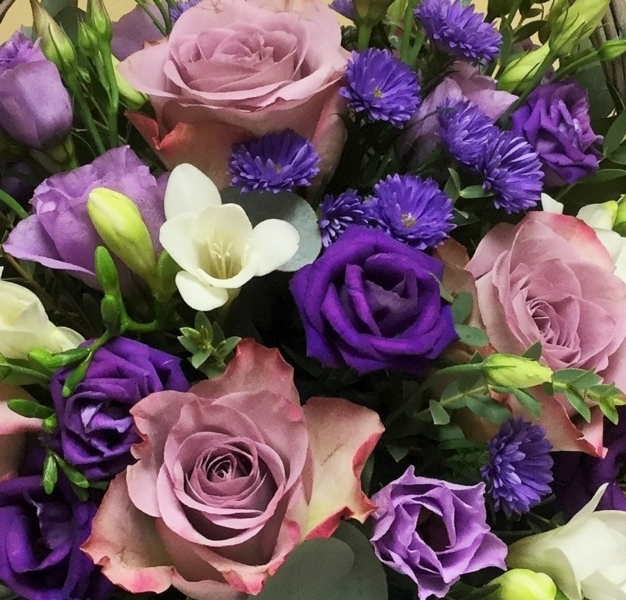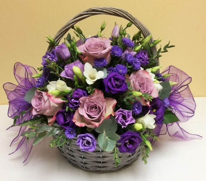 Vintage Basket £0.00 Options 15 inch £65.00 Add to Basket SKU: B121 A classic basket containing premium roses, freesia, September flower and lisianthus with mixed foliage and coordinating voile bows, measuring approximately 15 inches (37 cm) in length. Please note, the basket design may vary. Message: