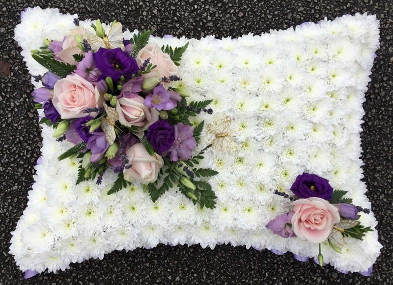Vintage Pillow £0.00 Options 18 inch £155.00 Add to Basket SKU: C&P104 An elegant pillow containing premium roses, freesia, lisianthus, veronica and lavender with double basing chrysanthemums and coordinating foliage, measuring approximately 18 inches (45 cm) in length. Message: