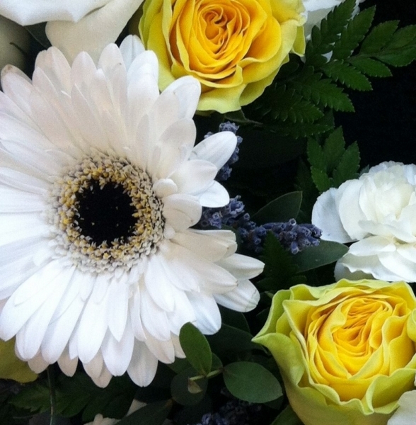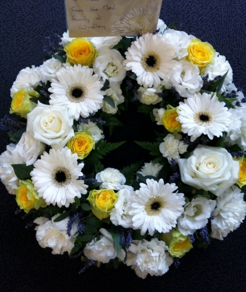 White and Lemon Wreath £75.00 Add to Basket SKU: W02 This lovely wreath contains gerbera, quality roses, carnations, lisianthus and lavender with coordinating foliage, measuring approximately 15 inches (37 cm) in diameter. Message: