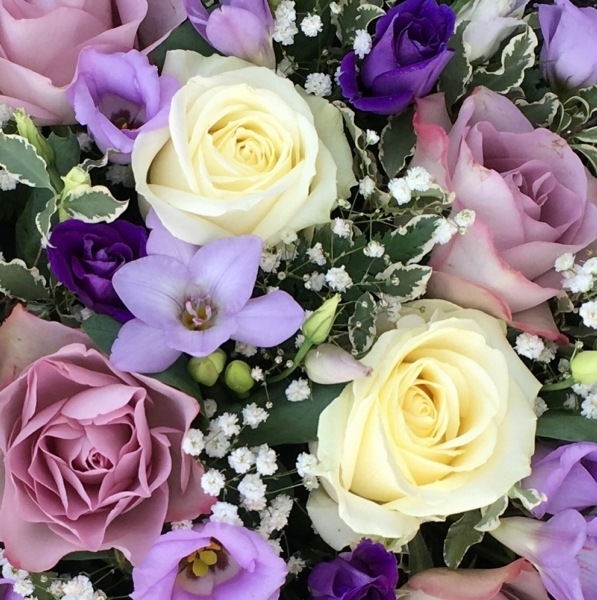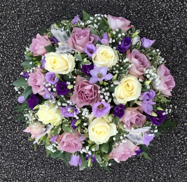 White and Lilac Posy Pad £0.00 Options 12 inch (as shown in picture) £85.00 14 inch £100.00 Add to Basket SKU: P66 This beautiful posy pad contains premium roses, freesia, lisianthus and gypsophila with mixed foliage and decorative butterflies, measuring 12 inches in diameter. Message: