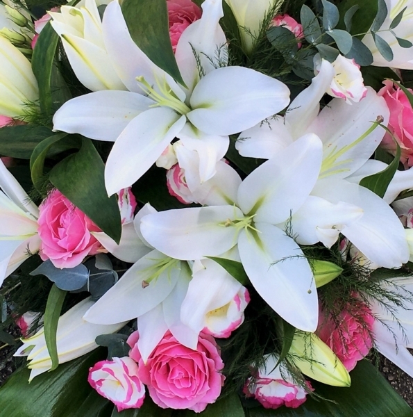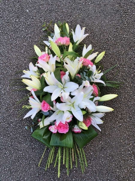 White and Pink Single Ended Spray £0.00 Options 2 foot £60.00 2.5 foot (as shown in picture) £75.00 3 foot £90.00 3.5 foot £105.00 4 foot £120.00 Add to Basket SKU: SE25 A stunning spray containing oriental lilies, premium roses and lisianthus with mixed foliage, measuring approximately 30 inches (75cm) in length. Message: