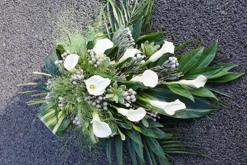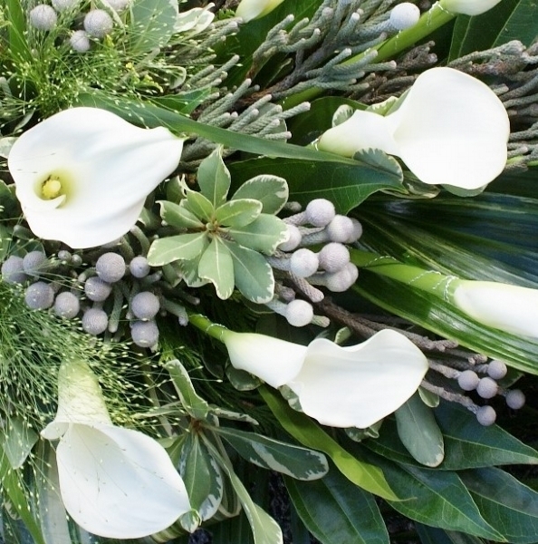 White Calla Lily Single Ended Spray £0.00 Options 2 foot (as shown in picture) £95.00 2.5 foot £120.00 3 foot £145.00 3.5 foot £170.00 4 foot £190.00 Add to Basket SKU: SE39 This striking single ended spray contains calla lilies, brunia and panicum with variegated foliage and stems, measuring approximately 24 inches (60 cm) in length. Message: