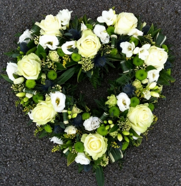 White Open Heart £0.00 Options 12 inch (as shown in picture) £90.00 15 inch £115.00 Add to Basket SKU: H89 This superb open heart contains premium roses, lisianthus, freesia, spray chrysanthemums and eryngium with variegated foliage, measuring approximately 12 inches (30 cm) in width. Message:
