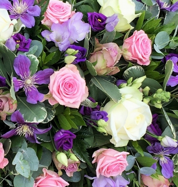 White Pink and Purple Double ended Spray £0.00 Options 3 foot (as shown in picture) £175.00 4 foot £235.00 5 foot £295.00 6 foot £350.00 Add to Basket SKU: DE13 A wonderful double ended spray contains premium roses, clematis, freesia, lisianthus, snapdragons and veronica with mixed foliage measuring approximately 36 inches (90 cm) in length. Message: