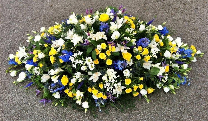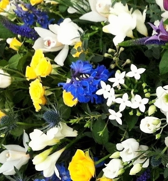 White Yellow and Blue Double Ended Spray £0.00 Options 3 foot £170.00 4 foot (as shown in picture) £225.00 5 foot £285.00 6 foot £340.00 Add to Basket SKU: DE9 This memorable double ended spray contains cymbidium orchids, delphinium, spray roses, clematis, bouvardia, freesia, lisianthus & veronica with coordinating foliage, measuring approximately 48 inches (120 cm) in length. Message: