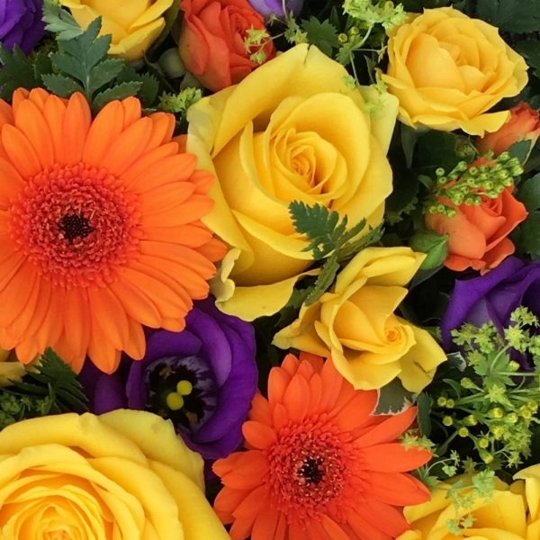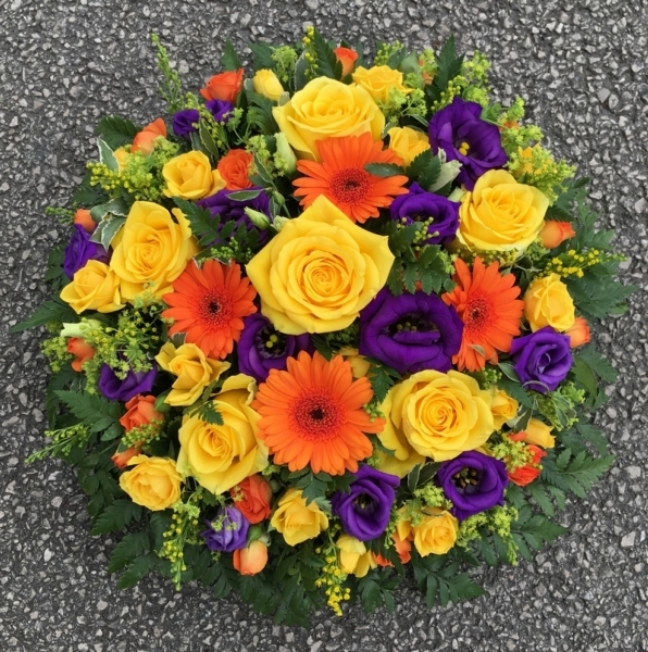 Yellow and Orange Posy Pad £0.00 Options 12 inch (as shown in picture) £75.00 14 inch £90.00 Add to Basket SKU: P62 This stunning posy pad contains premium roses, germini, spray roses, lisianthus and solidago with coordinating foliage, measuring 12 inches in diameter. Message: