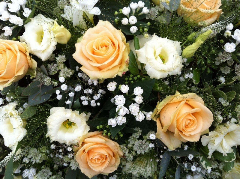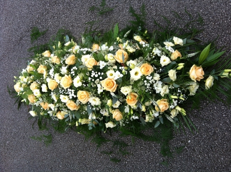 Yellow and White Double Ended Spray £0.00 Options 3 foot £195.00 4 foot £260.00 5 foot (as shown in picture) £325.00 6 foot £390.00 Add to Basket SKU: DE27 An magnificent spray containing premium roses, lisianthus, gypsophila, astrantia, bouvardia and veronica together with mixed foliage including fountain grass and cascades of asparagus fern, measuring approximately 60 inches (150 cm) in length. Message: