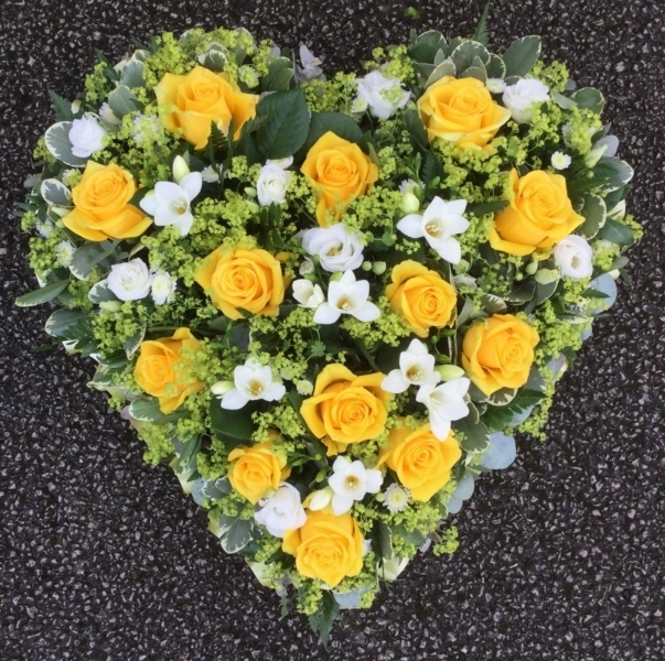 Yellow and White Heart £0.00 Options 12 inch (as shown in picture) £125.00 15 inch £160.00 Add to Basket SKU: H87 This beautiful heart contains premium roses, freesia, lisianthus, stallion chrysanthemums and alchemilla mollis with coordinating foliage, measuring 12 inches (30 cm) in width. Message: