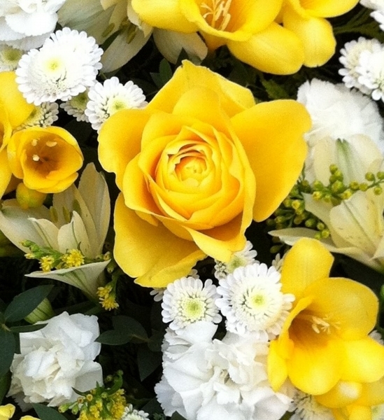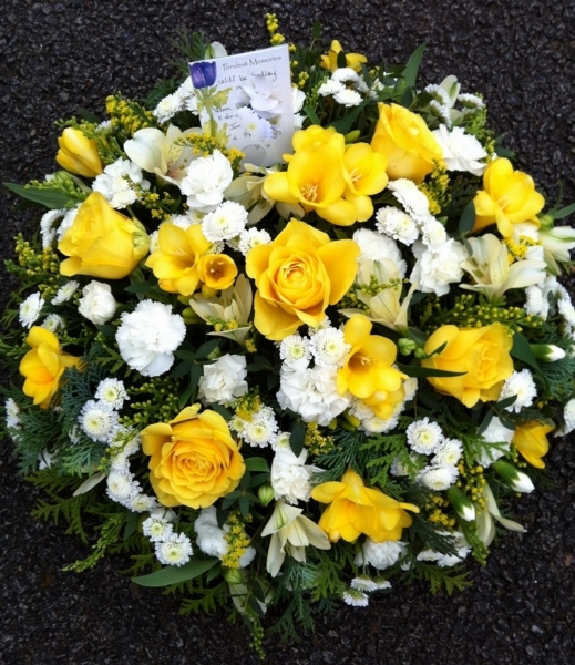 Yellow and White Posy Pad £85.00 Add to Basket SKU: P09 This pretty posy pad contains quality roses, freesia, stallion chrysanthemums and spray carnations with mixed foliage, measuring approximately 18 inches (45 cm) in diameter. Message: