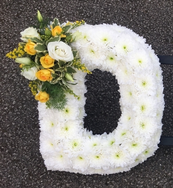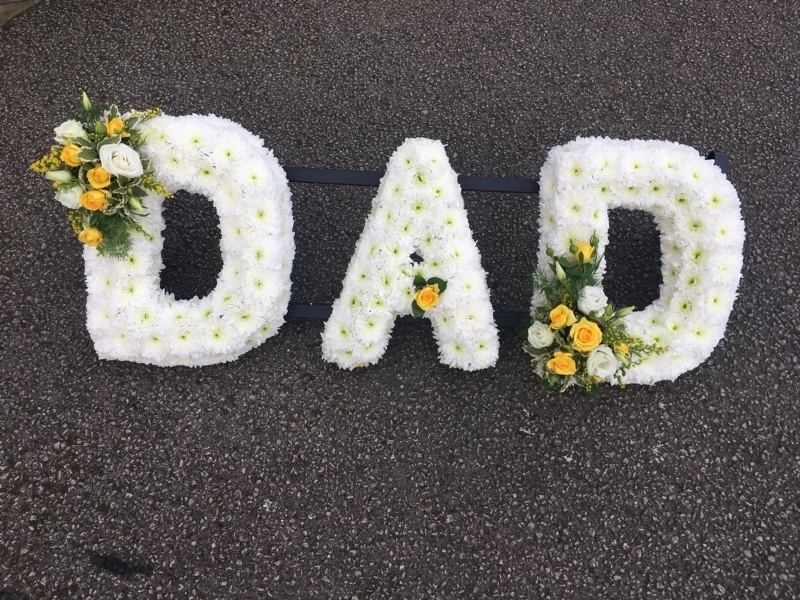 Individual tributes can be created using your choice of letters, this is based using white double chrysanthemums, edged with yellow ribbon and highlighted with beautiful yellow and white sprays using quality spray roses, solidago and lisianthus with variegated foliage.