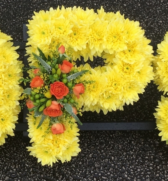 Individual tributes can be created using your choice of letters, this is based using yellow double spray chrysanthemums, highlighted with beautiful vibrant coloured sprays using spray roses, freesia, hypericum, solidago and veronica with mixed foliage.