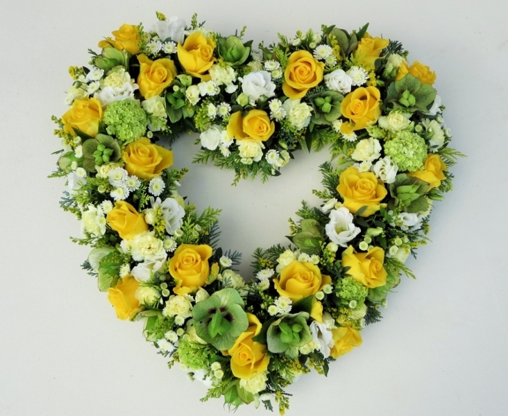 Yellow Open Heart £125.00 Add to Basket SKU: H16 This amazing open heart contains premium roses, viburnum, hellebores, spray carnations and stallion chrysanthemums with mixed foliage, measuring approximately 18 inches (45 cm) in width. Message: